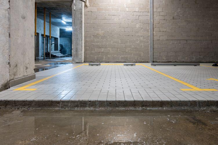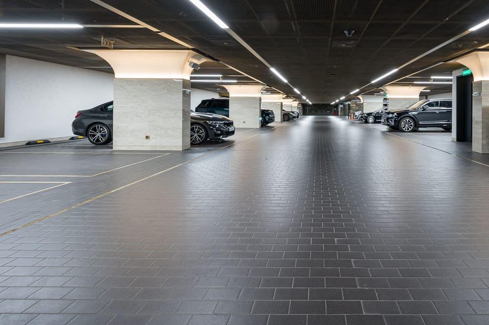 Преимущества керамического пола в подземных паркингах с точки зрения сохранения эстетики на долгие годы очевидно и бесспорно. Керамическое покрытие обладает повышенной прочностью, его не портят автомобильные шипы и поверхность остается невредимой на долгие годы. Прочности подстилающего слоя толщиной от 80 мм из цементно-песчаной смеси М-150 при вибровтапливании вполне достаточно для распределенной нагрузки на одну плитку 200х200 мм – от 20 до 40 тонн. В итоге мы получаем монолитный пол с прочнейшей керамической поверхностью. Затраты на дальнейшую эксплуатацию, в случае возникновения каких либо ремонтных случаев с течением времени, минимальны. Керамический пол обладает высокой ремонтопригодностью, ему не страшны масляные пятна, которые легко и бесследно удаляются с его поверхности при уборке. На выездах и рампах применяется брусчатка из натурального гранита или вибропрессованного бетона, которая так же укладывается методом вибровтапливания.